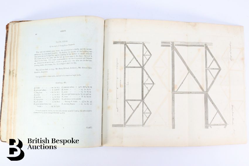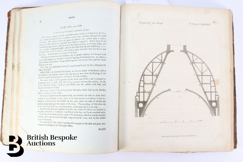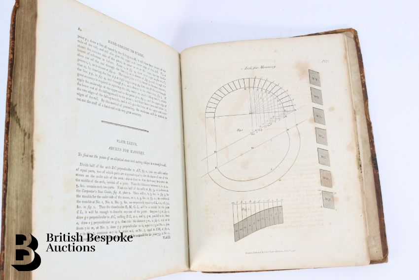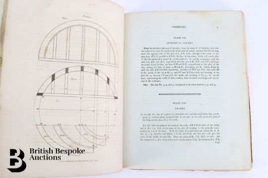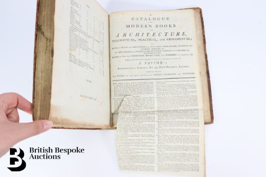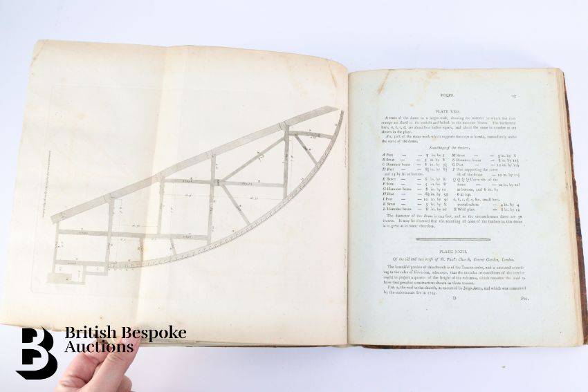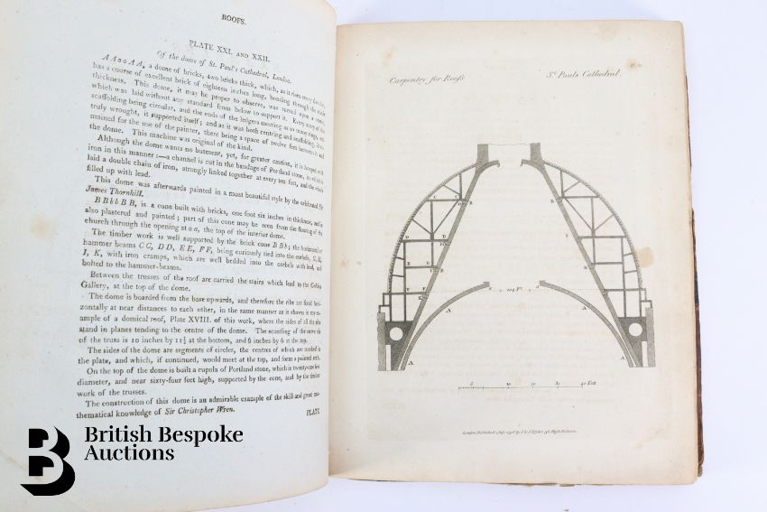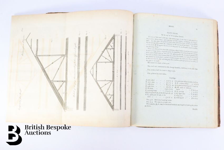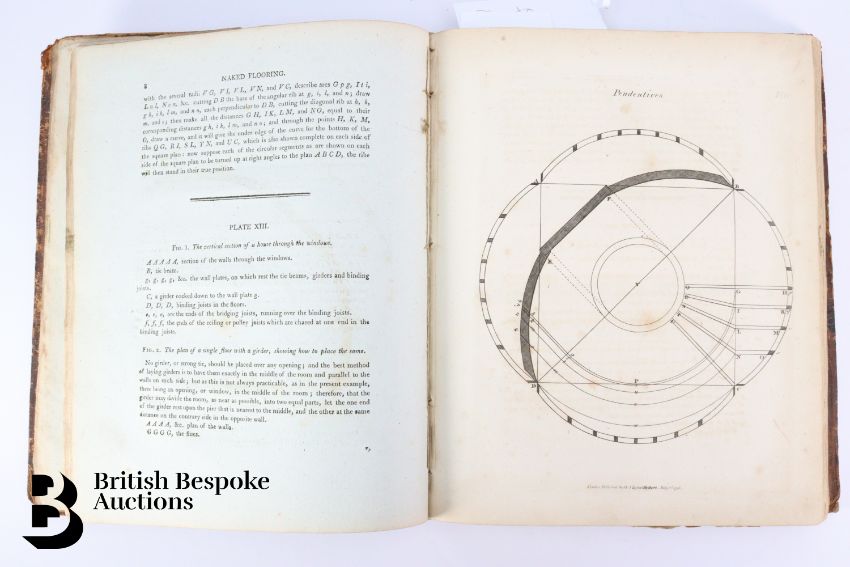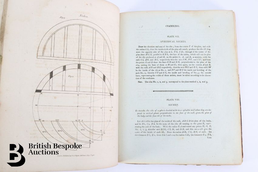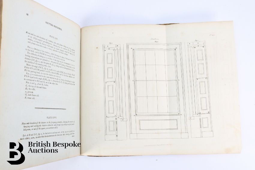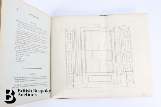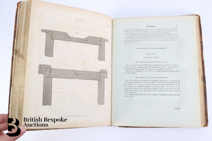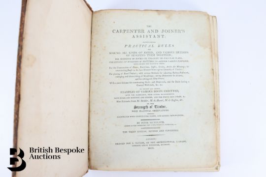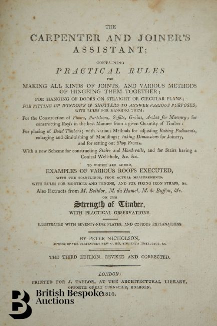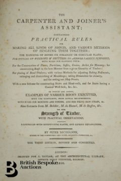 The Carpenter's and Joiner's Assistant containing practical Rules for making all Kinds of Joints, and Various methods of Hinging them together, for Hanging of Doors on Straight or Circular Plans by Peter Nicholson, published J Taylor at the Architectural Library, London 1810, 3rd edition, 79 full page engravings, some pull out plates. Some browning and foxing - a scarce book. Unfortunately the spine has been crudely rebacked.