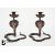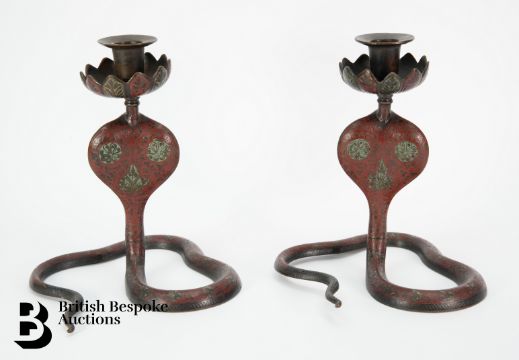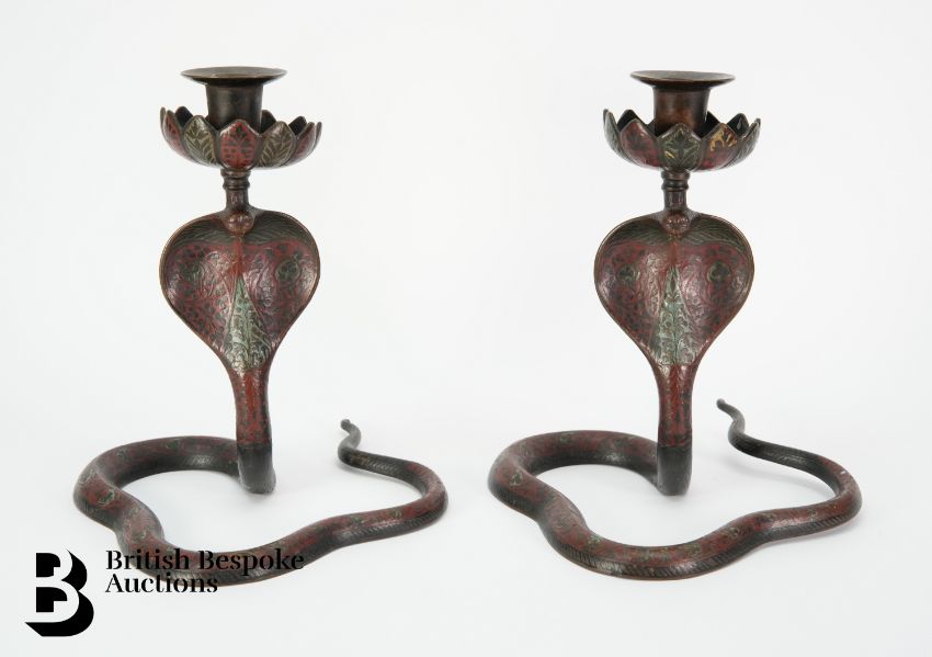 Pair of 20th century Indian enamelled hooded cobra candlesticks, approx 21 cms h.