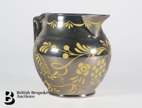 A canary yellow silver lustre ware jug, decorated with birds and stylized flowers, unmarked but in the Gray's Pottery style, approx 13 cms.