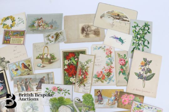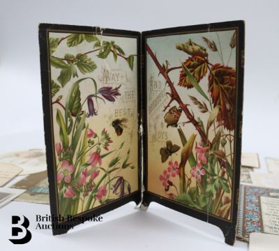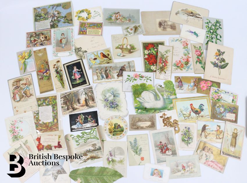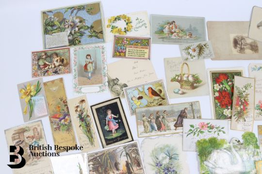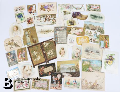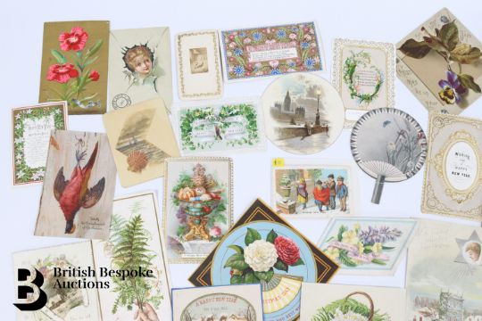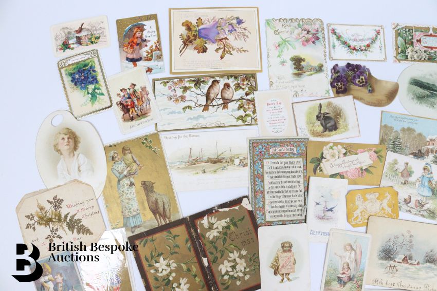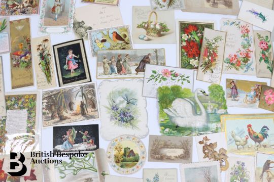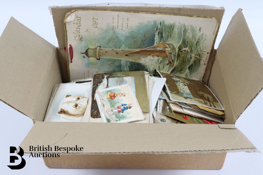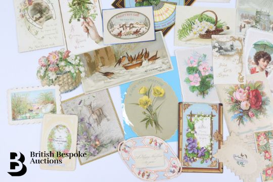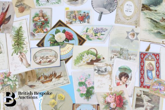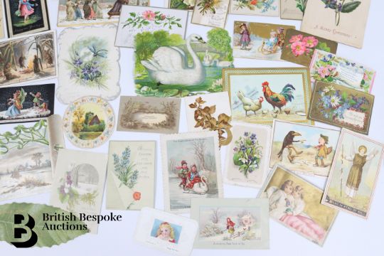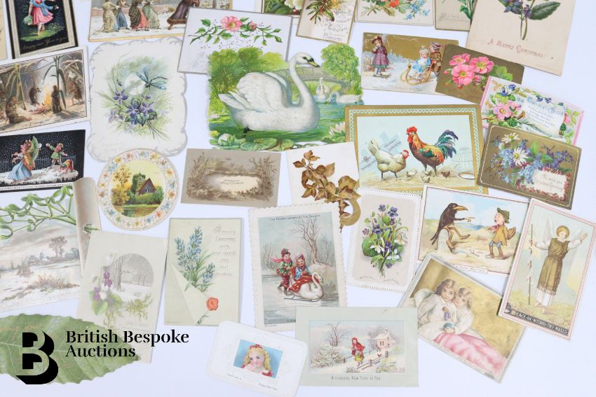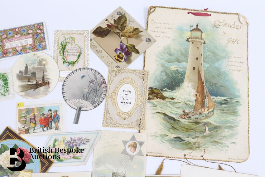 Collection of charming Victorian greetings cards, mostly Christmas and New Years, including die cut, paper lace, etc. Approx. 630 cards, good condition, some glue residue to backs. Plus a mechanical calendar from 1897 in working order.
