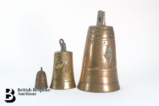 A large brass Middle Eastern bell, decorated with concentric circles and lozenge, approx 27 cms together with a small version approx 17 cms h. (2)