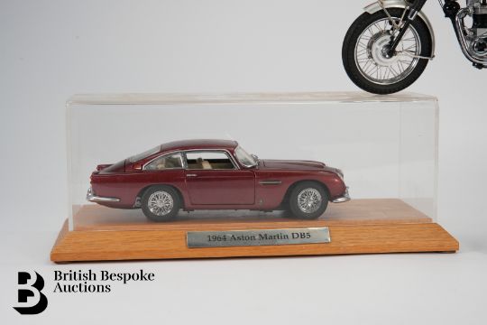 James Bond 007 Aston Martin DB5 in grey livery and a 1964 Aston Martin DB5 in burgundy livery, both on an oak plinth with clear perspex cover. This lot concludes with a 1960 Triumph Bonneville model motorbike. (3)