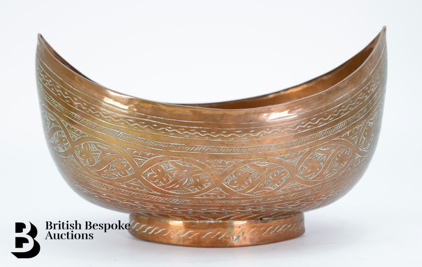 Iranian copper and brass, including a large copper water vessel approx 44 cms h, with incised decoration; brass water ewer with naturalistic handle approx 31 cms h, copper begging bowl approx 19 x 11 cms together with a trinket dish and circular bowl.