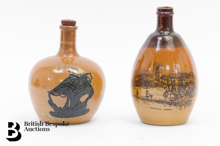 Doulton stoneware whisky flagon, 17.5 cms h, impressed marks to base; together with a Doulton Lambeth whisky flagon depicting Balmoral Castle, approx 20 cms h. (2)