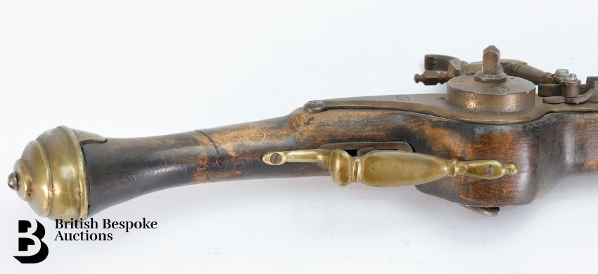 A flintlock pistol, 19th century in style, with brass hardware, complete with ramrod and copper powder flask.