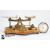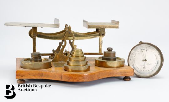 Early 20th century brass scales, together with a quantity of brass and lead weights, ideal for a country kitchen. This lot concludes with a brass cased Negretti & Zambra desk barometer nr 2287, approx 12 cms diameter.