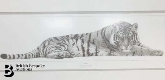 Gary Hodges limited edition print, nr 287/950. The print depicts a Siberian Tiger Supreme, approx 95 x 28 cms, mounted, framed and glazed.