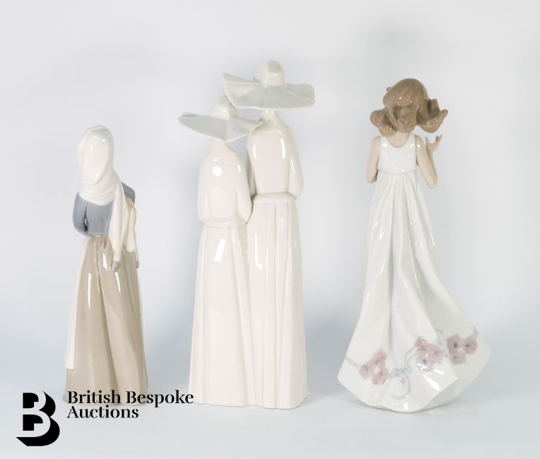 Lladro figurines, including a pair of doves nr 1169 approx 21 x 16 cms, a young girl nr 6777 approx 32 cms h, girl with lamb G-11 approx 28 cms h and a group of nuns nr G-30J approx 33 cms h, all with factory marks.