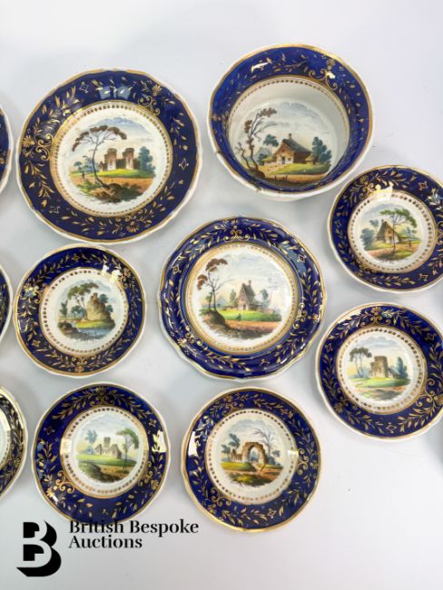 Fine English porcelain part dessert set, circa 1820, likely Coalport, comprising eleven 14 cms plates, two medium plates 21 cms d, one 18.5 cms plate, one slop bowl (with staple repair), each plate individually painted with architectural scenes, enclosed by cobalt blue rim heightened with gilt foliate scrolling, numbered to verso in puce 122, otherwise unmarked.
