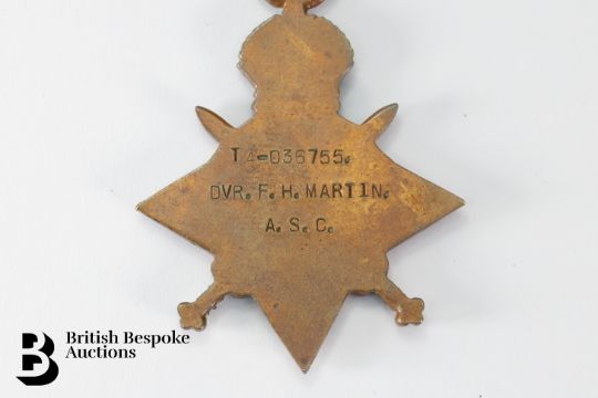 WWI medals, named to T4-036755 Dvr F.H Martin A.S.C including 1914-15 Star, British War medal, Victory medal. (3)