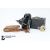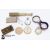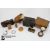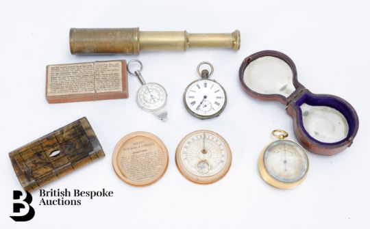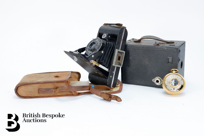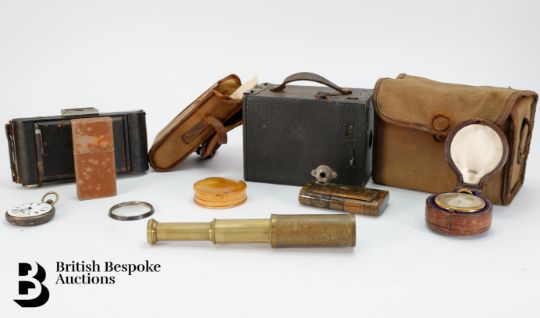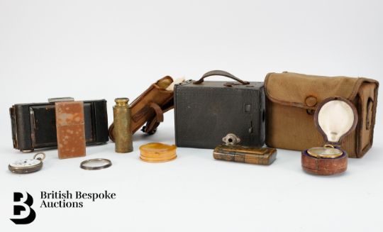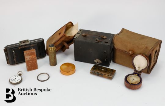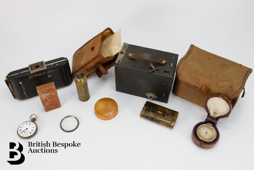 Compensated pocket barometer to one side, reading 0 to 10,000, and what would have been a mercury thermometer to the other (mercury and glass removed) centered by a 1" compass on the reverse side (signed Singer's patent), housed in the original burgundy leather box. A pocket sun-dial and compass housed in a satin wood case; an early 19th century snuff box in burr wood with tortoiseshell inner lining approx 9 x 5 cms (hinges are a little tight); vintage Swiss made map curvimeter, used to measure the lengths of curved lines, typically on maps, with dials for both centimeters and inches. This lot concludes with a Continental open faced pocket watch, 45mm case with white enamel Roman dial (loose glass) and two vintage cameras incl. Kodak Model D Anastigmat folding camera, F=6.3 100mm lens in the original case, nr 2 Brownie in the original case circa 1900's.