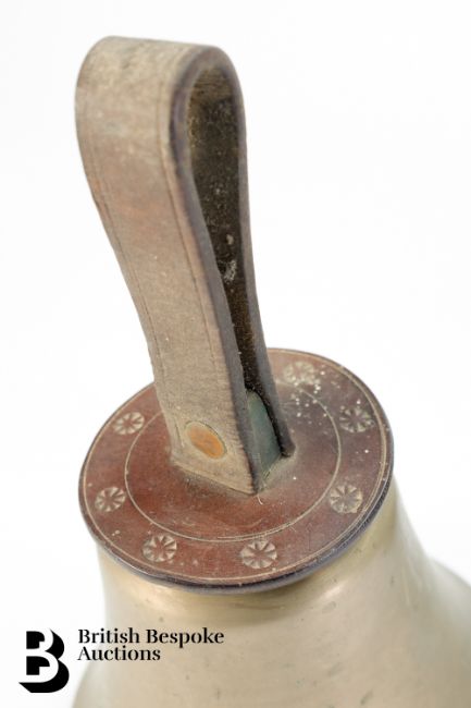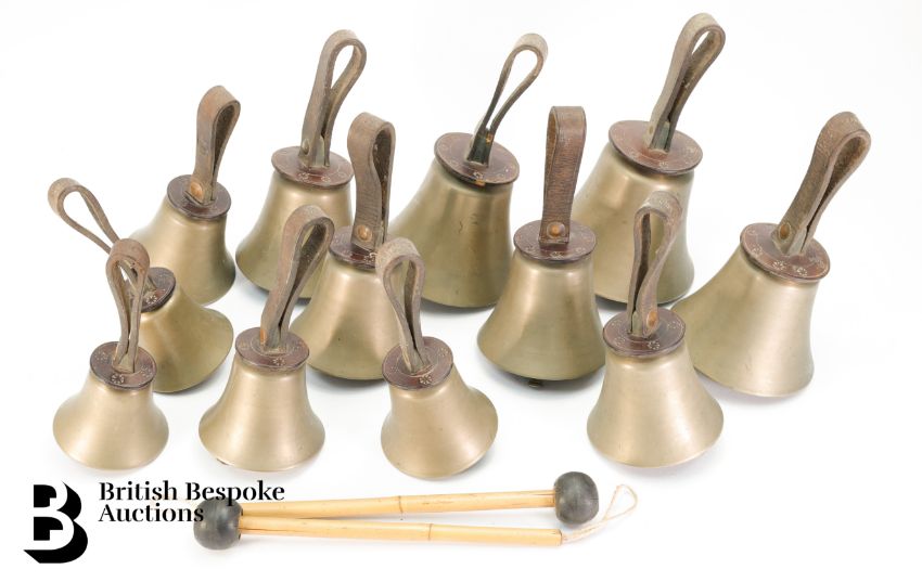 Set of twelve graduated brass hand bells, with stitched leather handles, embossed with stars and stamped WHITE.