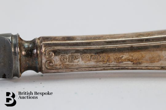 Miscellaneous silver including a silver compact stamped 835 engraved with roses; silver caddy spoon stamped 835; a pair of small silver toast racks, Chester dated 1921; three silver topped vanity jars; white metal box with vacant cartouche; silver part hair brush and clothes brush, boxed set of butter knives and a small edition of hymns with silver cover together with a silver plated hip flask.