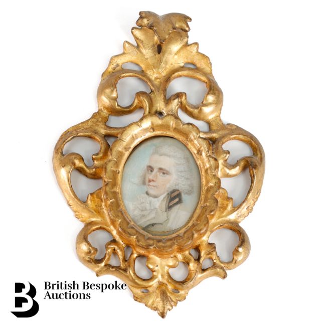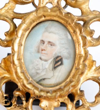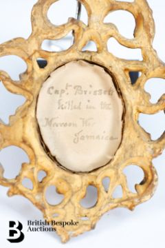 An 18th century portrait miniature of Captain Brissett, verso reads: Killed in the Maroon War, approx. 35 x 45 mm, in a Florentine frame, 9 x 13 cms.  Note: Captain John Brissett, was killed by the Maroons in September, 1795. The second Maroon War of 1795-1796 was an eight-month conflict between the Maroons of Cudjoe's Town (Trelawny Town), a maroon settlement later renamed after Governor Edward Trelawny at the end of First Maroon War, located near Trelawny Parish, Jamaica in the St James' Parish, and the British colonials who controlled the island.  Exemption Certificate 5M1K8AG9