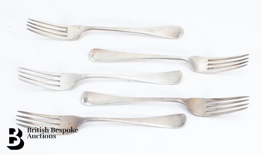 Miscellaneous silver flatware, including three silver forks, Sheffield dated 1900, mm John Round & Sons; two silver forks, London dated 1899, Brewis & Co, approx. 300 gms. This lot concludes with six silver teaspoons, Birmingham dated 1922, and miscellaneous silver spoons and a napkin ring, 100.7 gms.