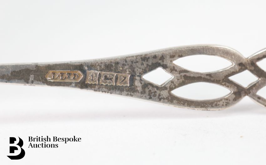 Silver sugar caster, Birmingham dated 1987, mm B & Co, approx.18.5 cms h, together with two silver napkin rings, six boxed silver coffee spoons, a white metal cockerel (af), and silver cigarette box, approx. 150 gms.