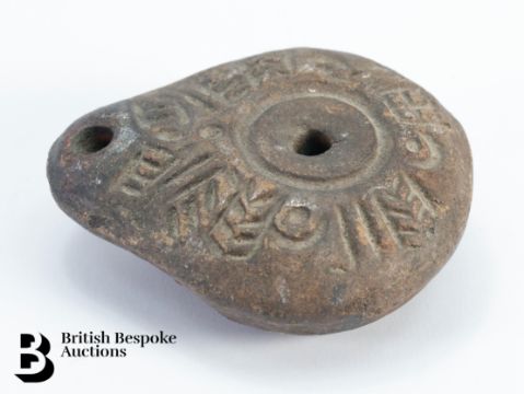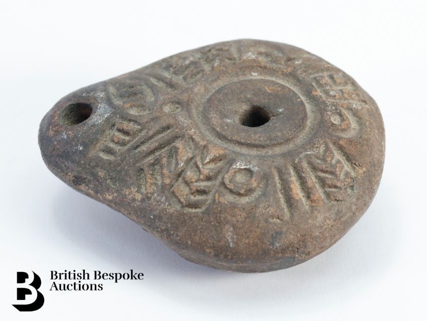 Romano-Egyptian 'Frog' lamp, approx. 75 x 65mm. The terracotta lamp is tear-drop shaped and exhibits a small spout along side a central filling hole, allowing for fuel refill. The lamps exterior is adorned with intricate incised decoration enclosing the filling hole. This lot concludes with a fossilized tooth, a flint arrowhead (archaic) and a quantity of semi-precious stones.