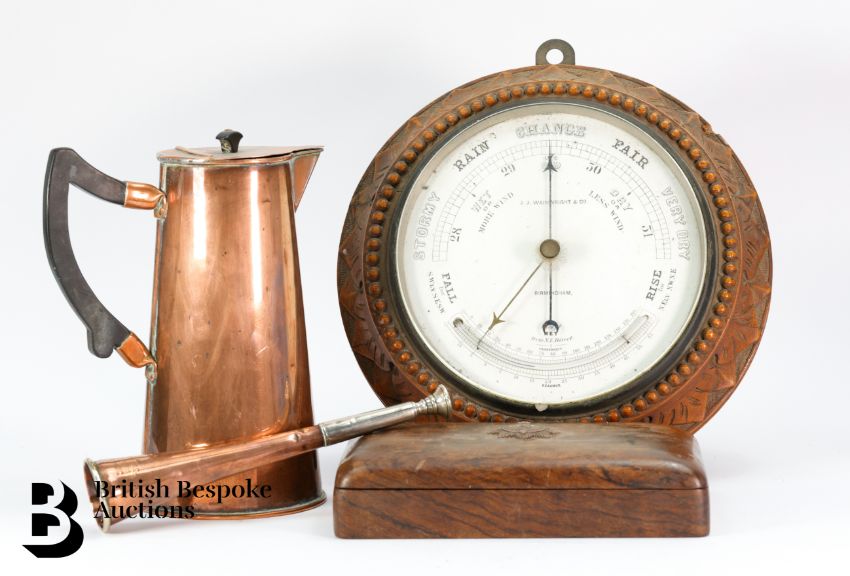 A hand carved box, approx. 22 x 13.5 cms, carved with an Royal Indian Army Service Corp insignia, a G.Parker & Sons Saddlery copper hunting horn approx. 23 cms l, a copper coffee pot and a J.J Wainwright & Co Birmingham barometer.