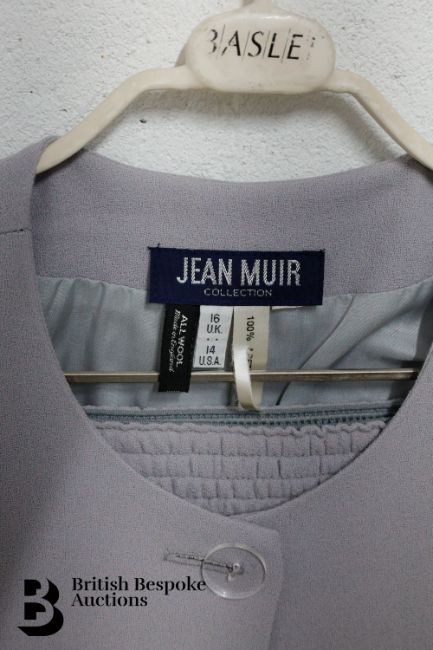Pre-loved vintage Jean Muir CBE fashion, including a lilac trouser suit size 12, lilac dress suit size 12,  pink jacket size 14, dove-grey dress suit size 14 and a purple dress suit size 14.