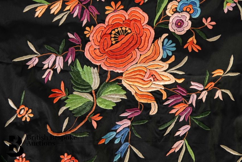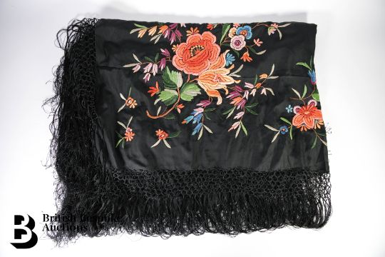 Black silk embroidered shawl, with long tassel, in lovely condition.