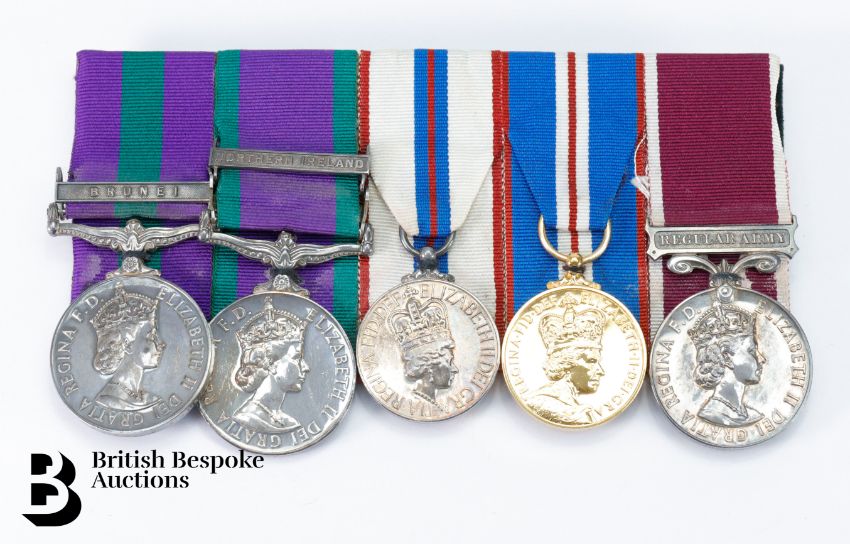 Military medals named to 23708205 Sig B. Young Signals Corps, including two General Service medals with clasp with Brunei and Northern Ireland, two Elizabeth II Commemorative medal 25 years on the throne and a Regular Army Long Service and Good Conduct medal, mounted for display.