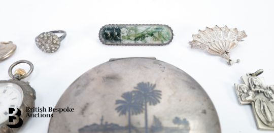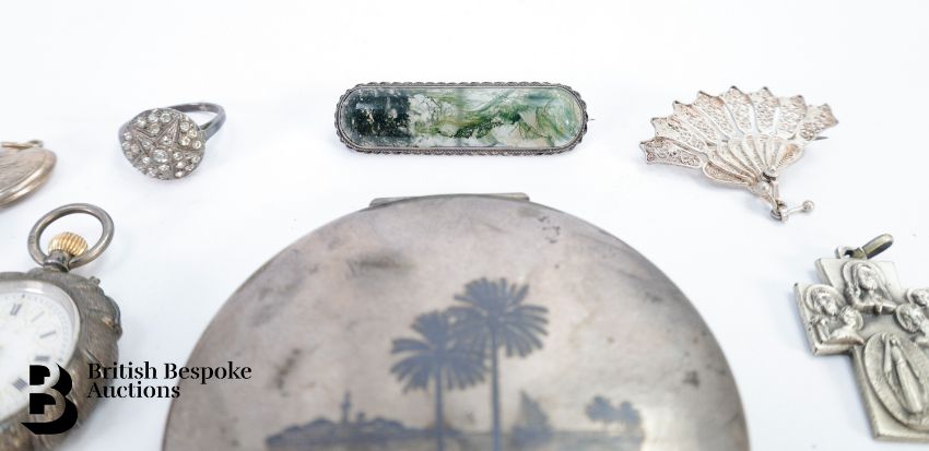 A silver Burrian Cross by Ola Gorie, approx. 40 x 40mm; silver cross pendant, St George medallion; silver heart locket, silver chain approx. 54 cms; Nieollo compact depicting Middle Eastern scenes, approx. 8 cms d; lady's Continental silver pocket watch with white enamel dial approx. 30mm; silver shield brooch approx.42mm; moonstone heart-shaped brooch; Moss agate brooch approx. 5 cms; silver filigree fan brooch; enamel buttons and stud pins, silver cross pendant. Total weight approx. 242gms.