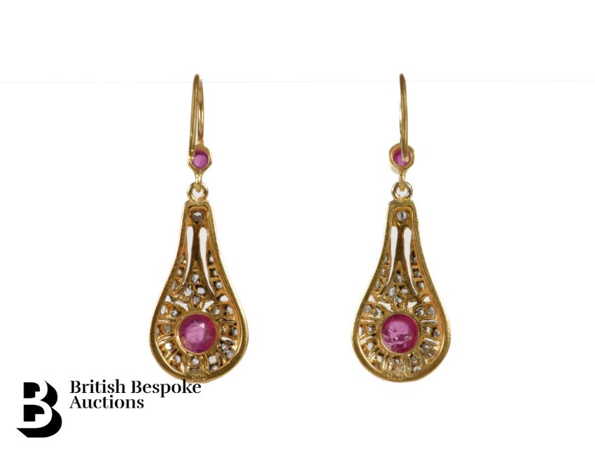 Pair of silver gilt earrings, 0.80 cts of rose cut dias, heightened with four rubies, 0.50 cts, approx 22mm.