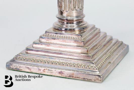 Pair of silver plated candlesticks, Corinthian column, with foliate capital, on stepped plinth, approx. 31 cms h.