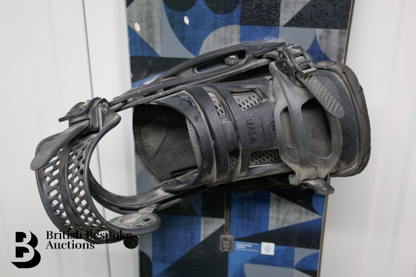 A pre-loved Burton snowboard, with dark grey Burton Malavita Freestyle bindings together with a pair of turquoise-blue Flow 5 bindings with quick release.